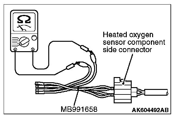 1. Disconnect the heated oxygen sensor connector and connect special tool MB991658 to the connector on the heated oxygen sensor side.