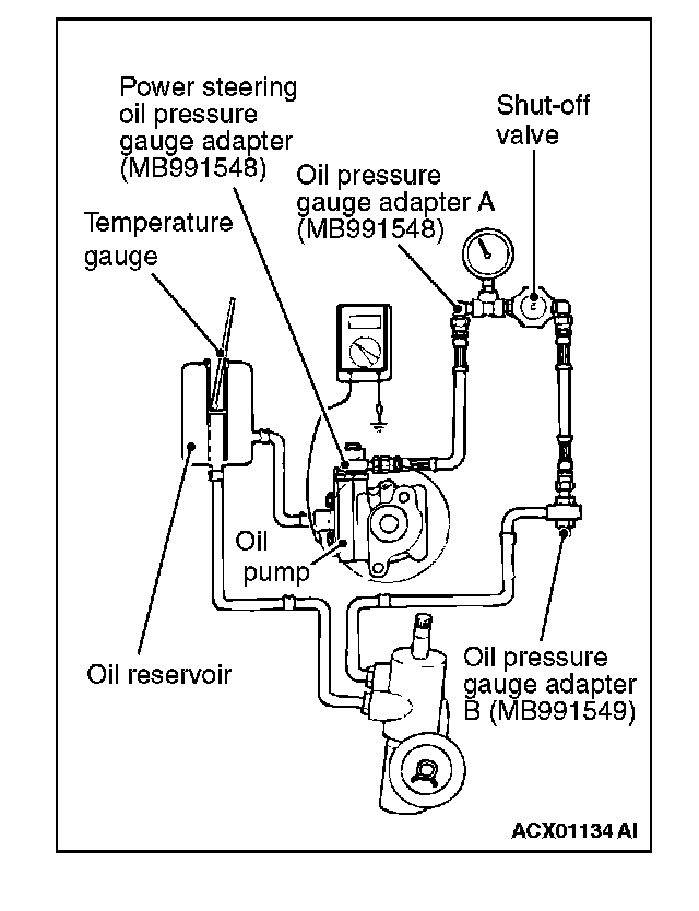 1. Disconnect the pressure hose from the oil pump, and then connect the special tools MB991548, MB990662 and MB991549.