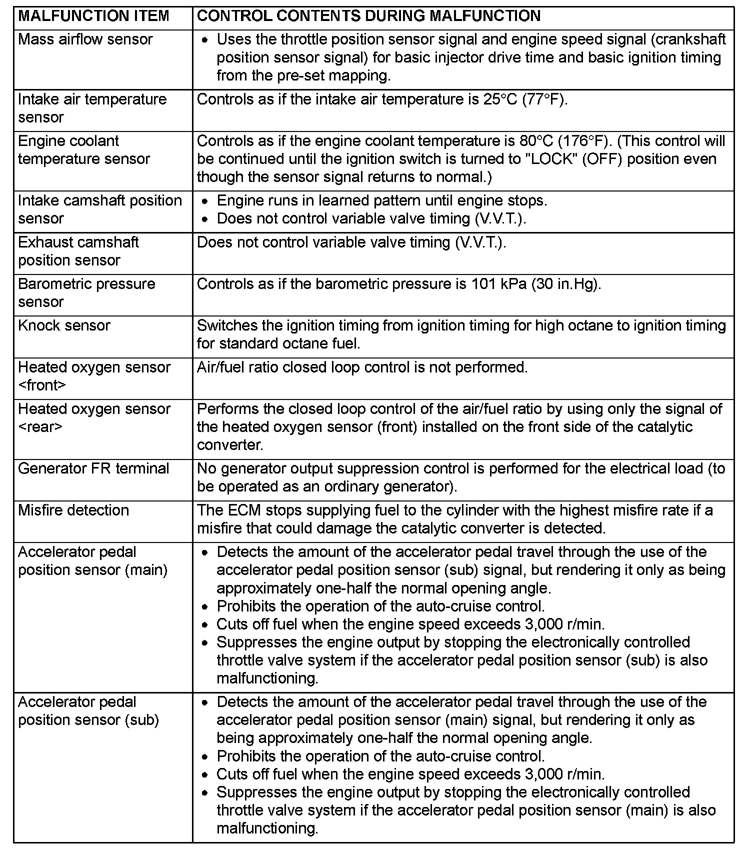 When the main sensor malfunctions are detected by the diagnostic test mode, the vehicle is controlled by means of the following defaults.