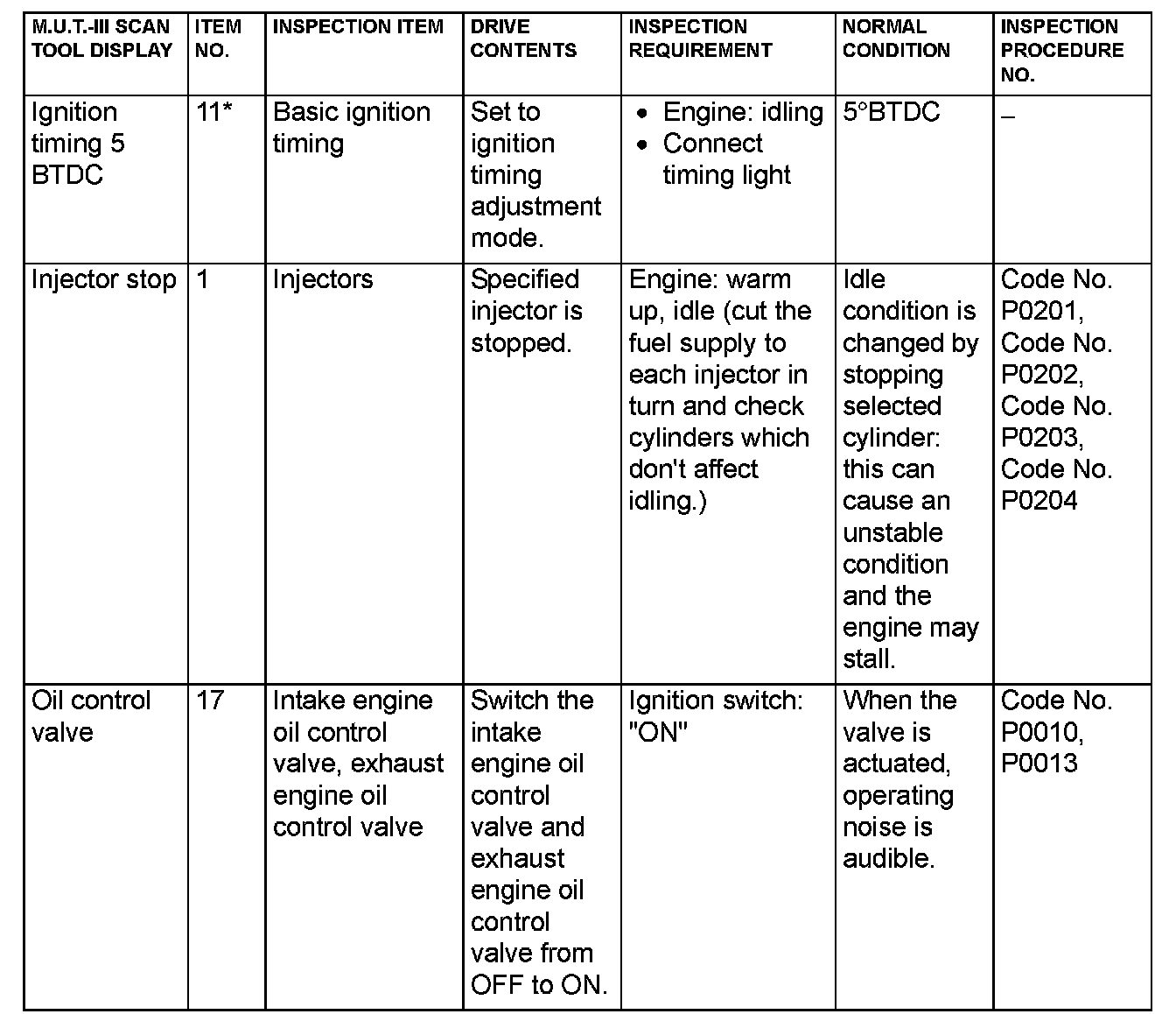 Actuator Test Reference Table