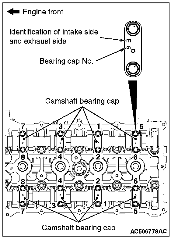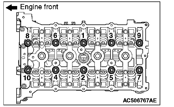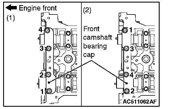 1. Temporarily tighten the front camshaft bearing cap mounting bolts to the specified torque in the order of the figure (1.)