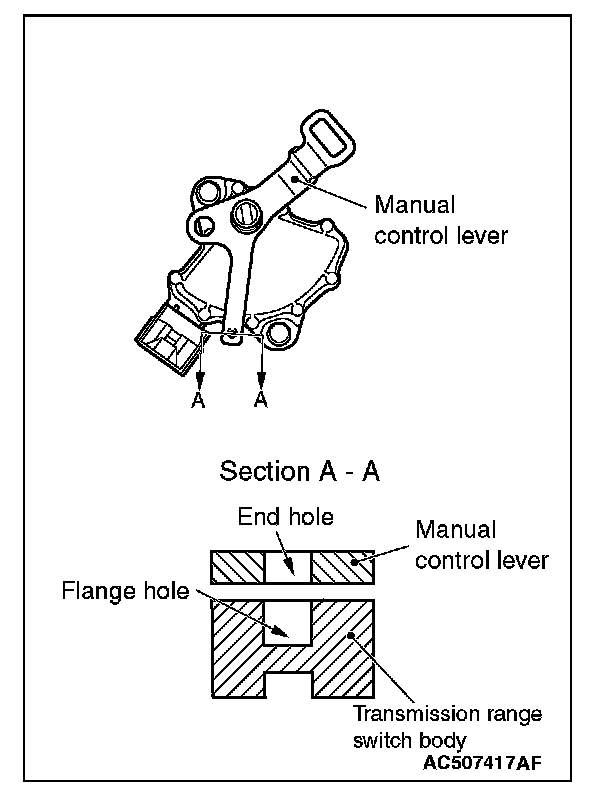 4. Align the hole at the end of the manual control lever and the hole in the transmission range switch body flange (section A - A).