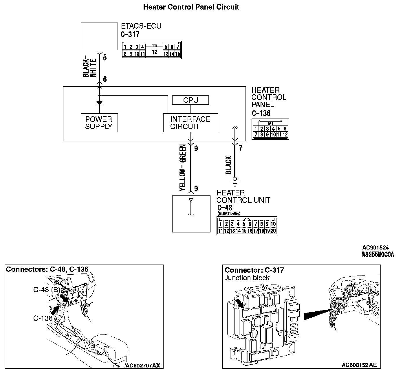 Q: s the wiring harness between heater control panel connector C-136 (terminal 6) and ETACS-ECU connector C-317 (terminal 5) in good condition?
