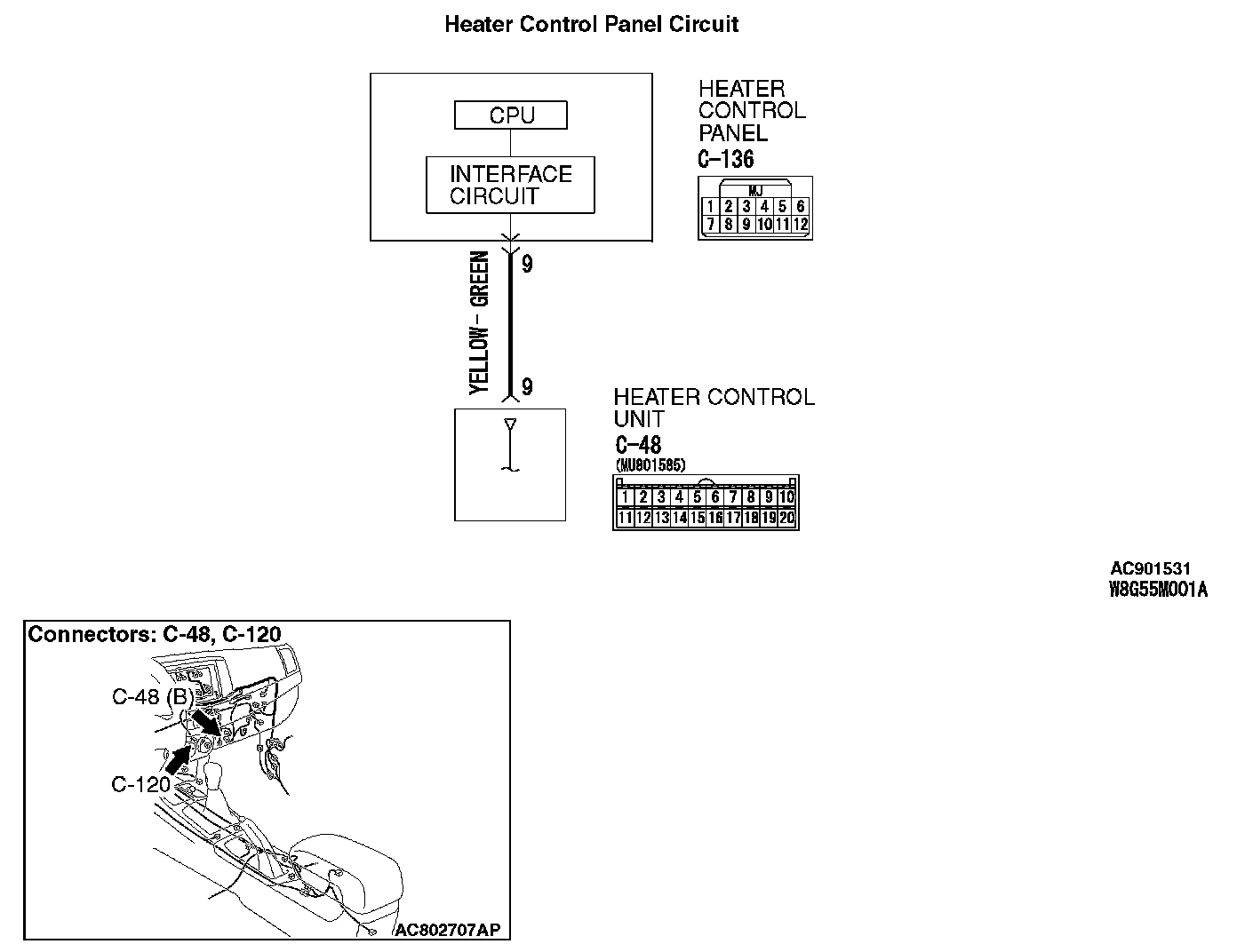 STEP 4. Check the wiring harness between heater control unit connector C-48 (terminal 9) and heater control panel connector C-136 (terminal 9).