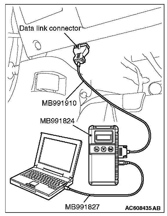 CAUTION: To prevent damage to scan tool (MB991958), always turn the ignition switch to the "LOCK" (OFF) position before connecting or disconnecting scan tool (MB991958).