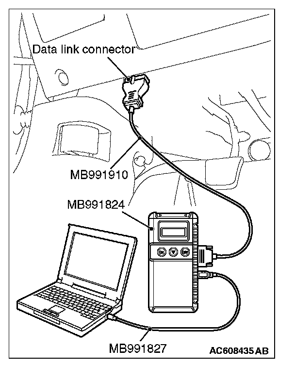 CAUTION: To prevent damage to scan tool MB991958, always turn the ignition switch to the "LOCK" (OFF) position before connecting or disconnecting scan tool MB991958.