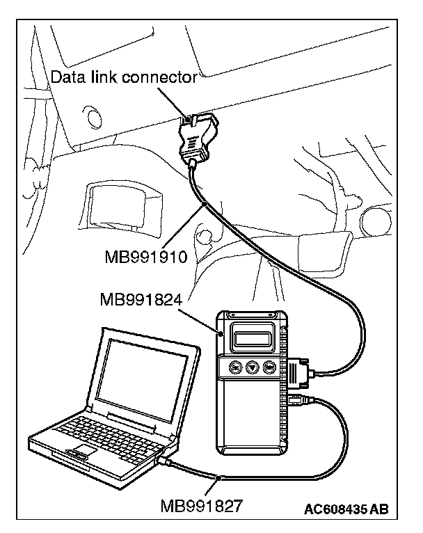 CAUTION: To prevent damage to scan tool MB991958, always turn the ignition switch to the "LOCK" (OFF) position before connecting or disconnecting scan tool MB991958.