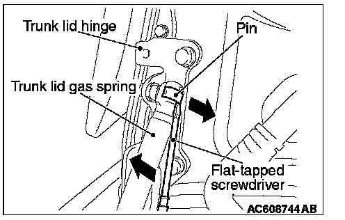 As shown in the figure, slide the pin upward, then remove the trunk lid gas spring in the direction of the arrow to unscrew the trunk lid hinge.
