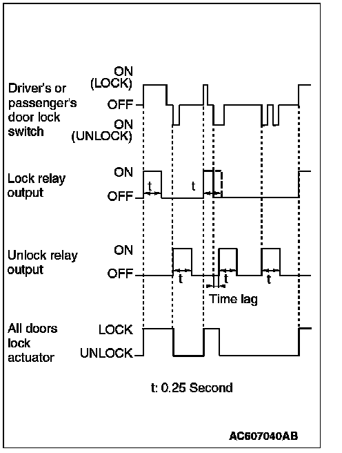 When the door is locked and unlocked by driver's or passenger's door lock switch consecutively, the ETACS-ECU operates its door lock relay and passes a current through the door lock actuators of all the doors for 0.25 second to lock all the doors. Then, the ETACS-ECU operates its door unlock relay and passes a current through the door lock actuators of all the doors for 0.25 second to unlock all the doors. Due to this, there may be a time lag between the driver's or passenger's door lock switch actuation and the time when all the doors are unlocked.