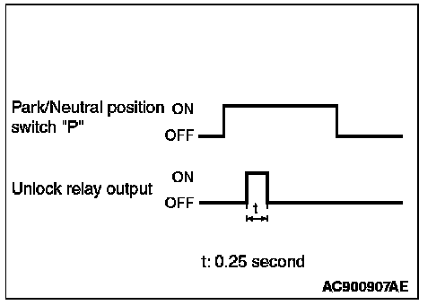 When the selector lever is shifted to the P position with the ignition switch turned ON, the transmission range switch "P" [CVT] or lever position sensor "P" [TC-SST] turns ON, ETACS-ECU turns the unlock relay output ON for 0.25 second to unlock all the doors.
