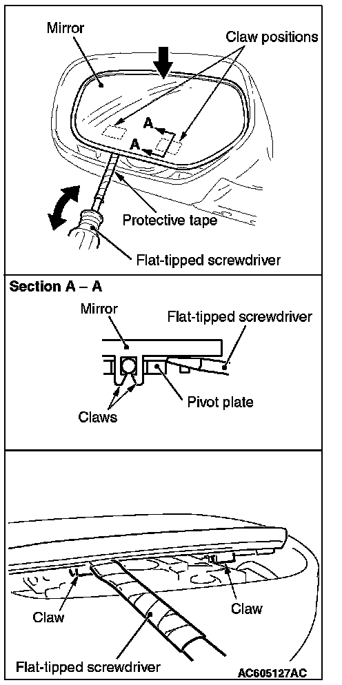 1. Slant the mirror upward with your hands. Then insert a flat-tipped screwdriver wrapped with protective tape between the pivot plate and mirror through the cut-out from behind the mirror. Now pry off the mirror tab and release the lower side of the mirror as shown in the illustration.