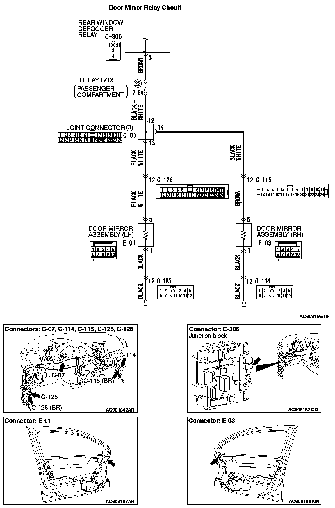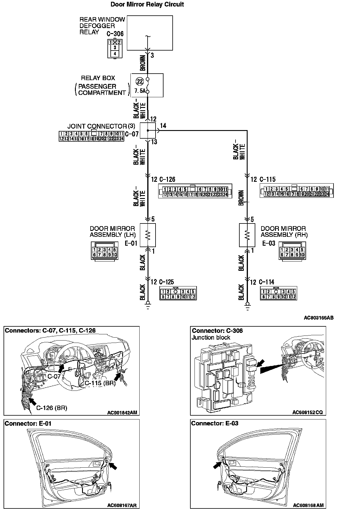 STEP 7. Check the wiring harness between door mirror (LH) connector E-01 (terminal 5) and rear window defogger relay connector C-306 (terminal 3).