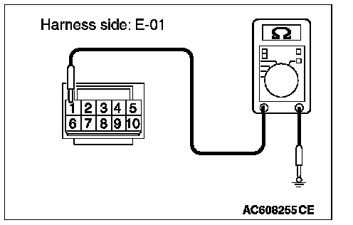 STEP 4. Check the ground circuit between door mirror (LH) connector E-01 and ground for open circuit. Measure the resistance at door mirror (LH) connector E-01.