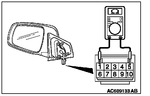 Check to see that the resistance between terminal 1 and 5 of the door mirror (RH) connector E-03.