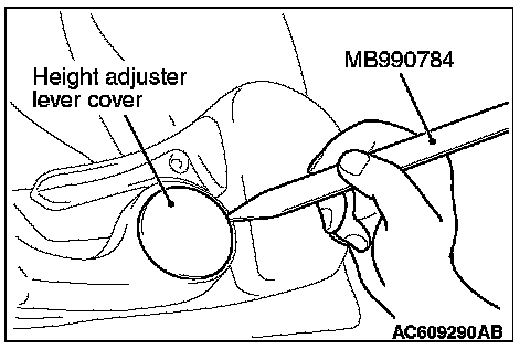 Use special tool MB990784 as shown to remove the height adjuster lever cover.