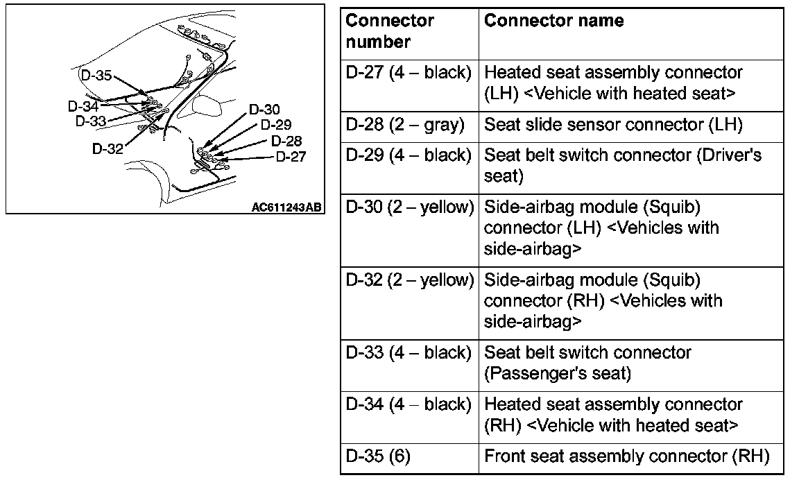 NOTE: When disconnecting the side air bag module connectors of D-30 and D-32, unlock the connector by sliding the locking button to the direction of the arrow as shown in the figure, and then disconnect the connector.