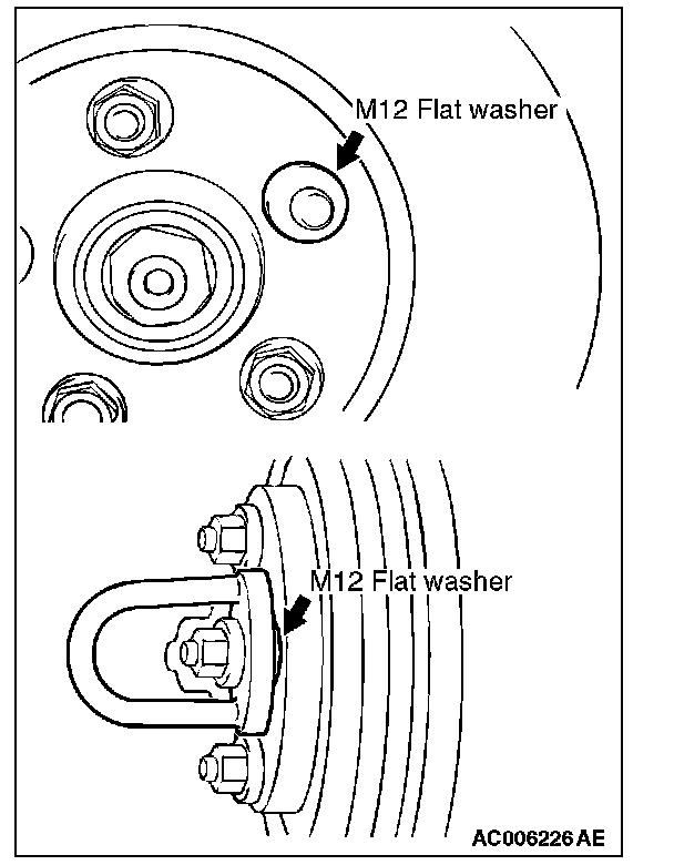 ^ When the on-the-car type lathe is used, first install M12 flat washer on the stud bolt in the brake disc side according to the figure, and then install the adapter. If the adapter is installed with M12 flat washer not seated, the brake disc rotor may be deformed, resulting in inaccurate grinding.