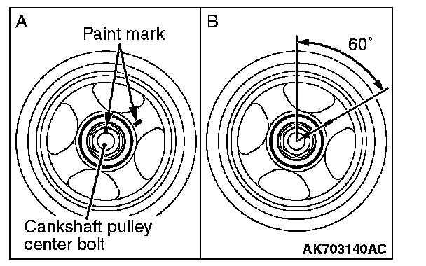 11. Tighten the crankshaft pulley center bolt by 60° once more. Make sure the paint mark of crankshaft pulley center bolt is aligned with the paint mark of crankshaft pulley as shown in the illustration "B."