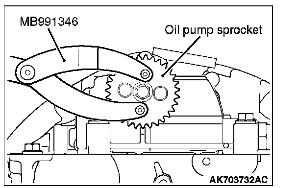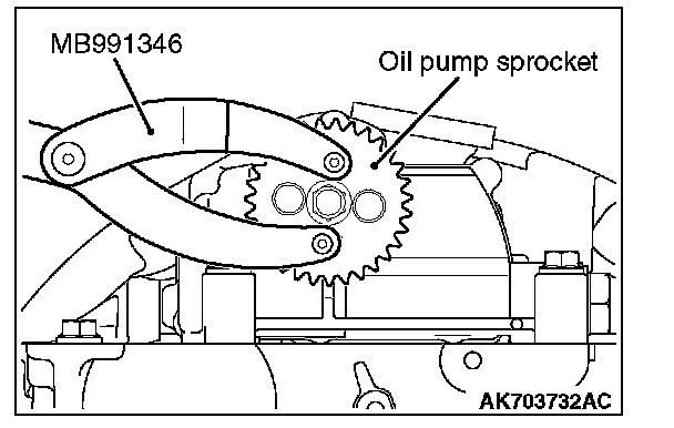 Fix the oil pump sprocket with a special tool MB991346, loosen a center bolt, and remove the oil pump sprocket.