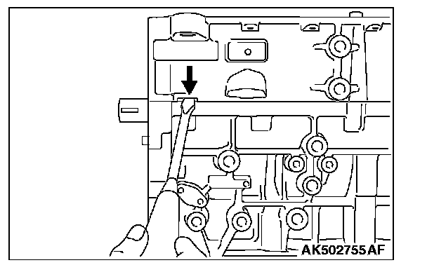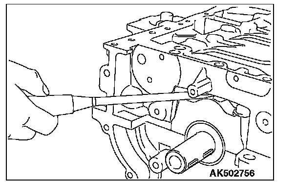 2. If the ladder frame does not come off, insert a flat blade screwdriver into the gap between the ladder frame and bearing cap as shown in the illustration and lightly pry it to remove the ladder frame.