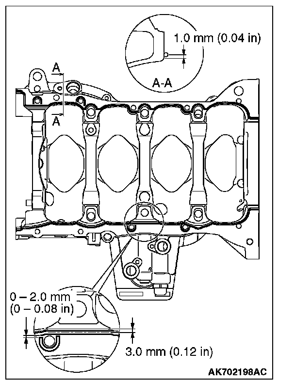 4. Squeeze liquid gasket (Three bond 1217G or exact equivalent) of [diameter]2.0 to 3.0 mm (0.08 to 0.12 inch) in thickness and apply it to the illustrated position of the cylinder block and ladder frame.