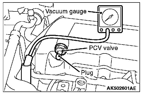 3. Disconnect the ventilation hose from the positive crankcase ventilation (PCV) valve, and then connect a vacuum gauge to the ventilation hose. Plug the PCV valve.
