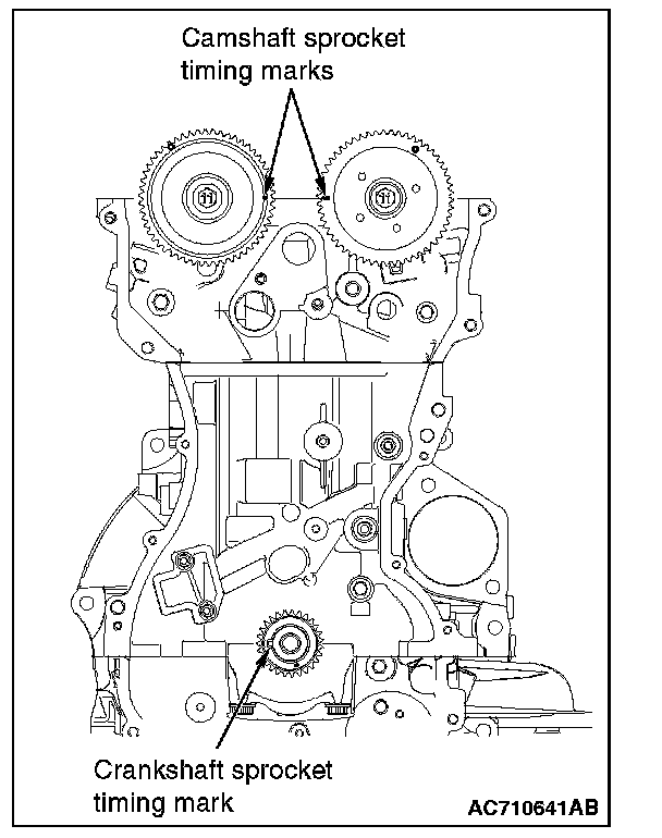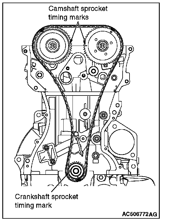 1. Set the timing marks of the camshaft sprockets and the crankshaft sprocket as shown in the figure.
