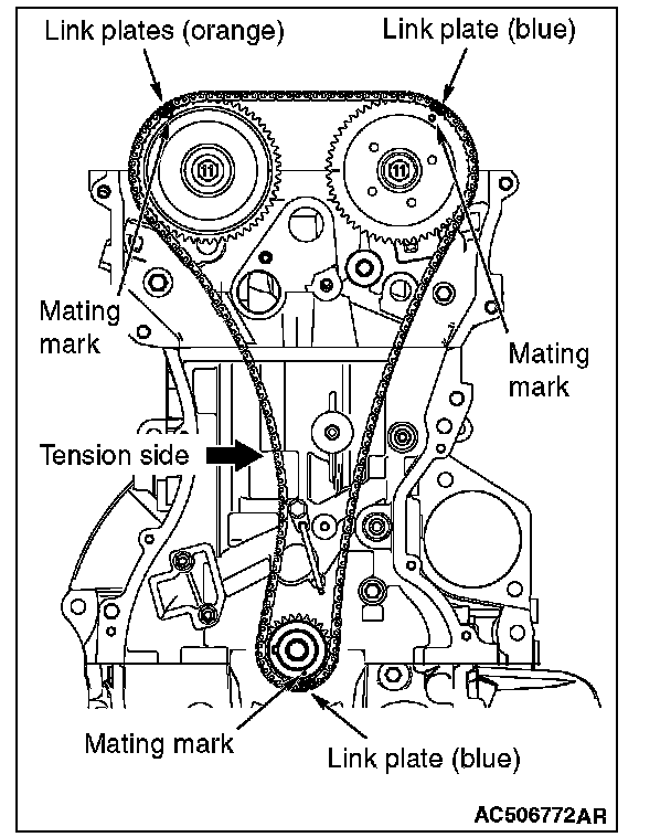 2. Align each sprocket timing chain mating marks with the link plate (orange or blue) of timing chain to avoid slack of the timing chain tension side, and install the timing chain to the sprockets.