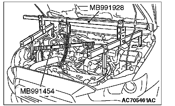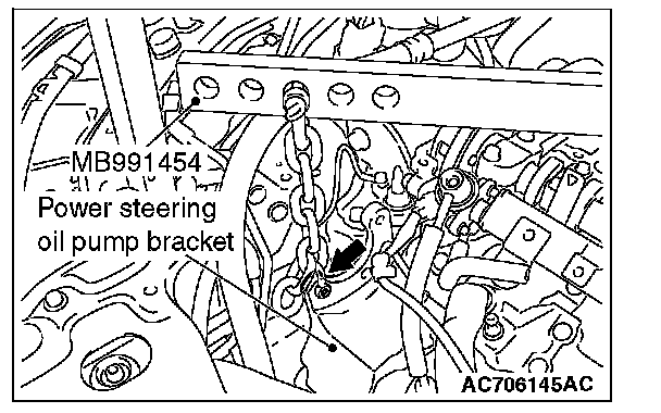 3) Mount special tool MB991454 to the power steering oil pump bracket and engine hanger, and set it to special tool MB991928 to support the engine and transaxle assembly.