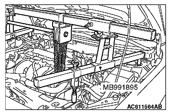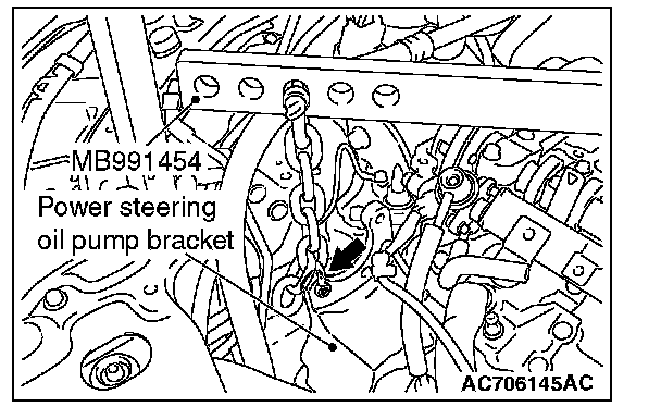 2) Mount special tool MB991454 to the power steering oil pump bracket and engine hanger, and set it to special tool MB991895 to support the engine and transaxle assembly.