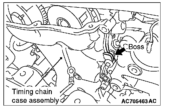 If the adhesive strength of sealant on the timing chain case assembly is so strong that the boss may be damaged by peeling off, do not peel it off forcibly.