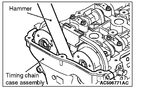1. After removing the timing chain case assembly mounting bolts, slightly pry the boss of the timing chain case assembly shown in the figure using a flat-tipped screwdriver, and remove the timing chain case assembly from the cylinder head and cylinder block.