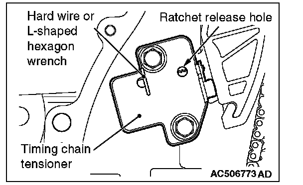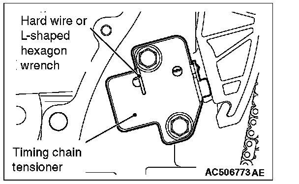 2. Remove the hard wire or L-shaped hexagon wrench fixing the plunger of the timing chain tensioner to apply tension to the timing chain.