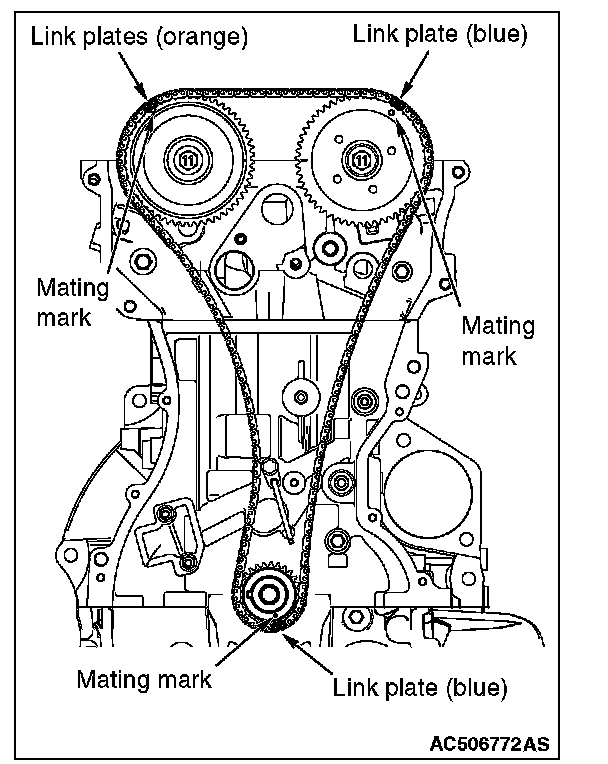 NOTE: At this time, it is not necessary that the link plate (orange or blue) of the timing chain always aligns with each sprocket timing mark.