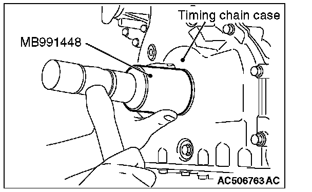2. Using special tool MB991448, press in the crankshaft front oil seal up to the chamfered surface of timing chain case.