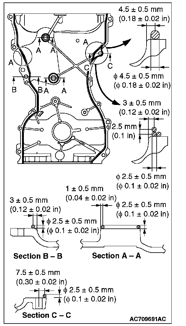 4. Apply a bead of the sealant to the timing chain case assembly mounting surface. The bead diameter should be 2.5 ± 0.5 mm (0.1 ± 0.02 inch.) Overlap the part "A" with the diameter of 4.5 ± 0.5 mm (0.18 ± 0.02 inch) or 2.5 ± 0.5 mm (0.1 ± 0.02 inch) as shown in the figure, and apply the sealant.