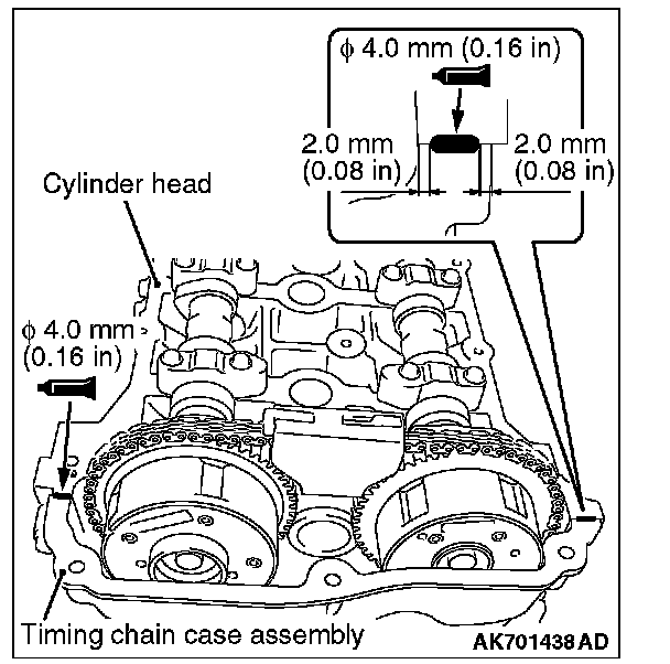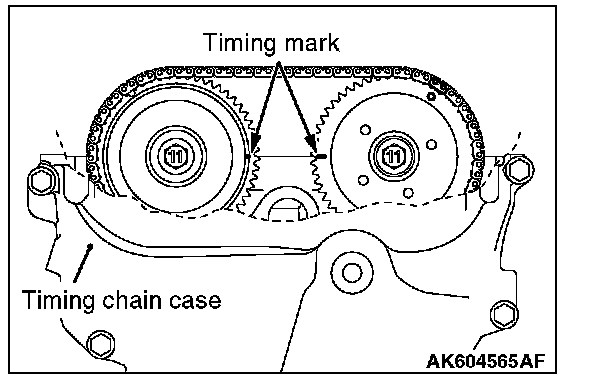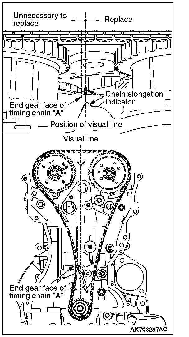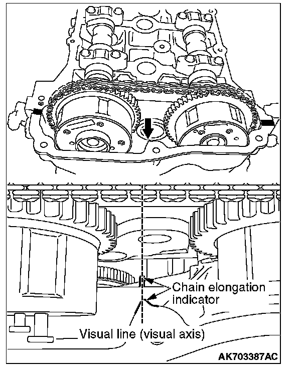 NOTE: When the timing chain elongates more than the specified length, the diagnostic trouble code No. P0012, variable valve timing (VVT) advanced-angle value abnormal, is set. Unless the diagnostic trouble code No. P0012, therefore, is set, the visual check is unnecessary.