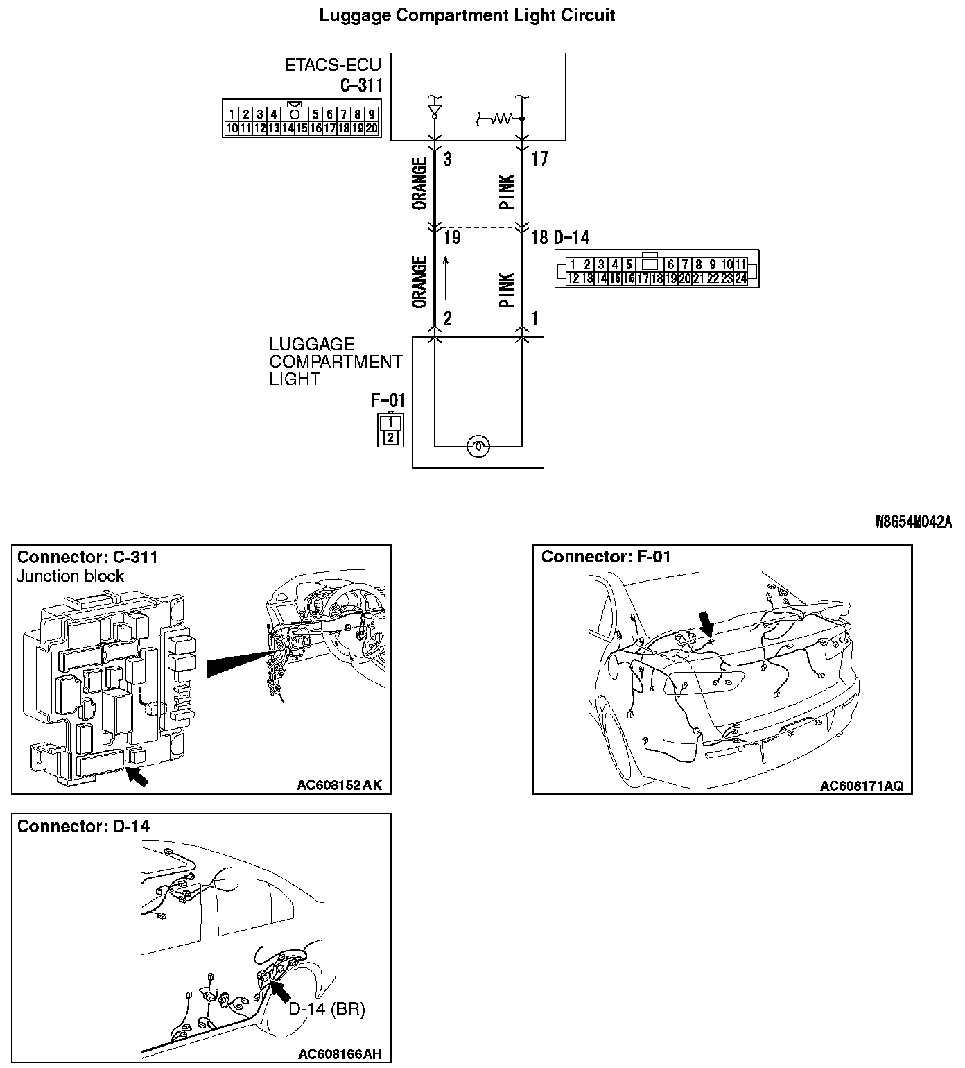 STEP 6. Check the wiring harness between luggage compartment light connector F-01 (terminal 1, 2) and ETACS-ECU connector C-311 (terminal 17, 3).