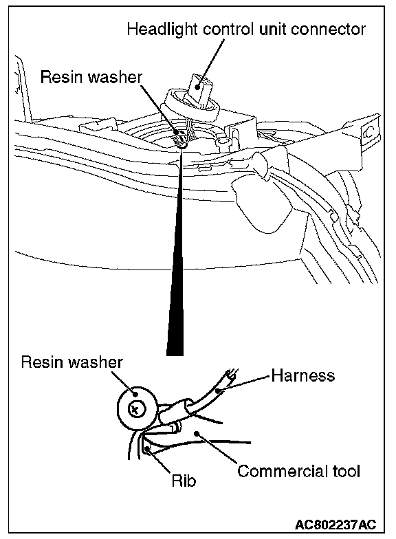 2. Install the harness to the headlight assembly. At that time, fitting the harness into the resin washer is unnecessary.