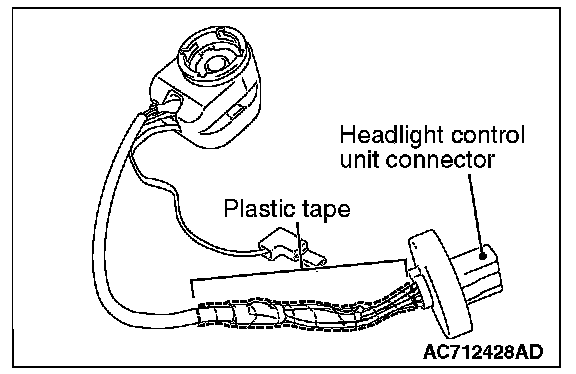1. As shown in the figure, doubly wrap the portion in the vinyl tape, from the headlight control unit connector root to the point where the harness separation is hidden.