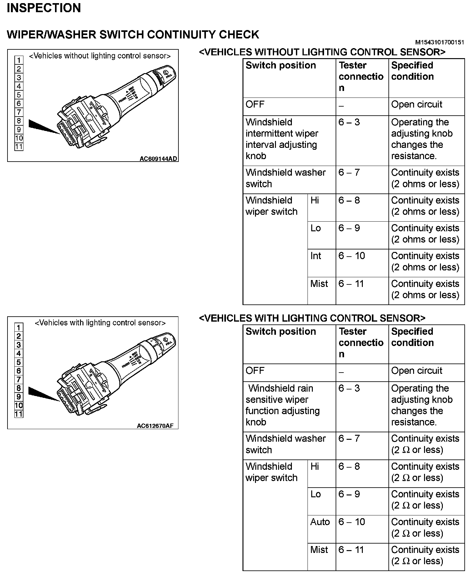 Wiper/Washer Switch Continuity Check:
