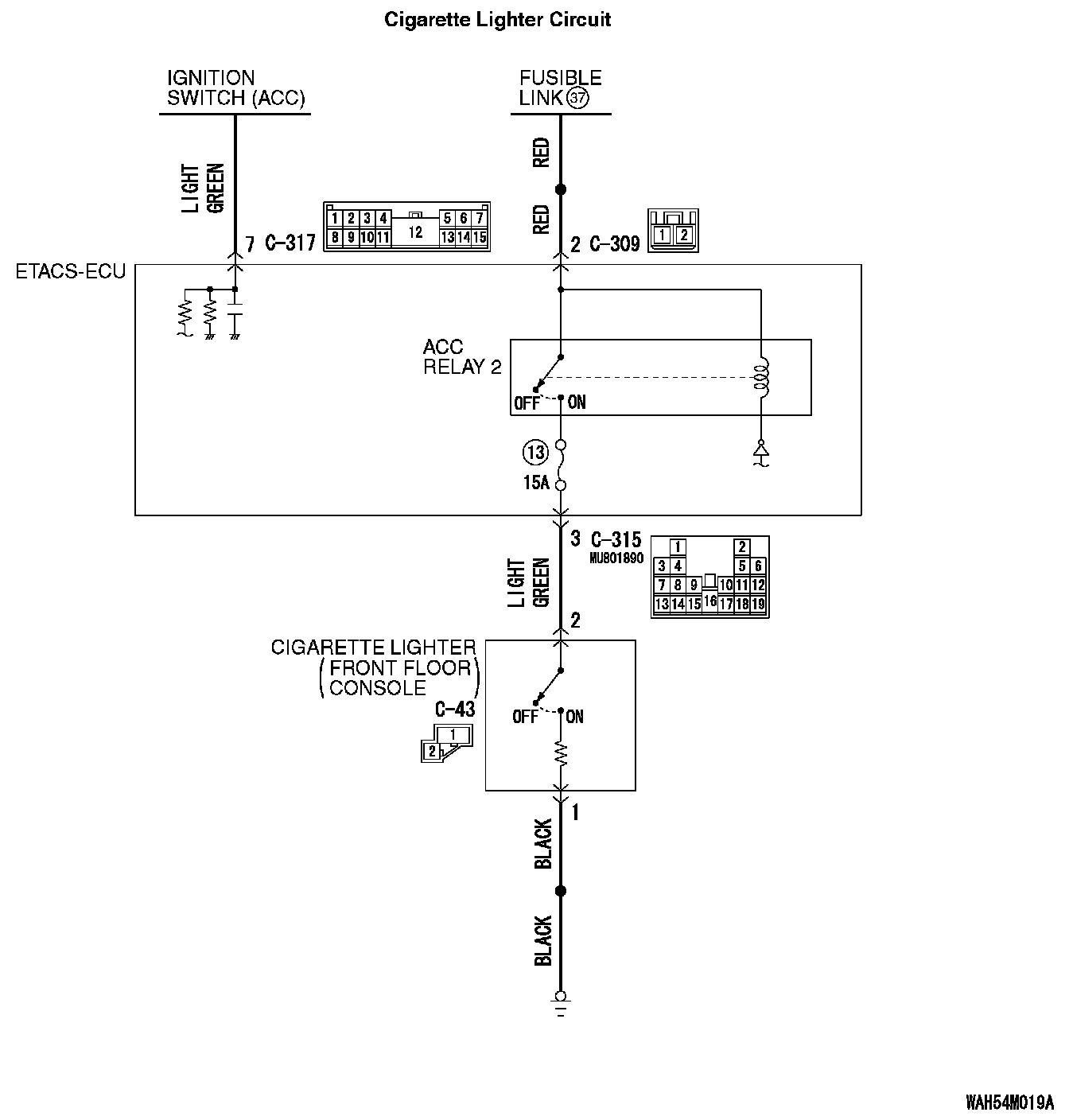 If the cigarette lighter cannot be used even when the ignition switch is in the ON or ACC position, ETACS-ECU, cigarette lighter itself, or cigarette lighter power supply circuit may have a problem.
