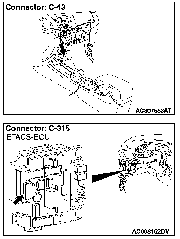 STEP 4. Check ETACS-ECU connector C-315 and cigarette lighter connector C-43 for loose, corroded or damaged terminals, or terminals pushed back in the connector