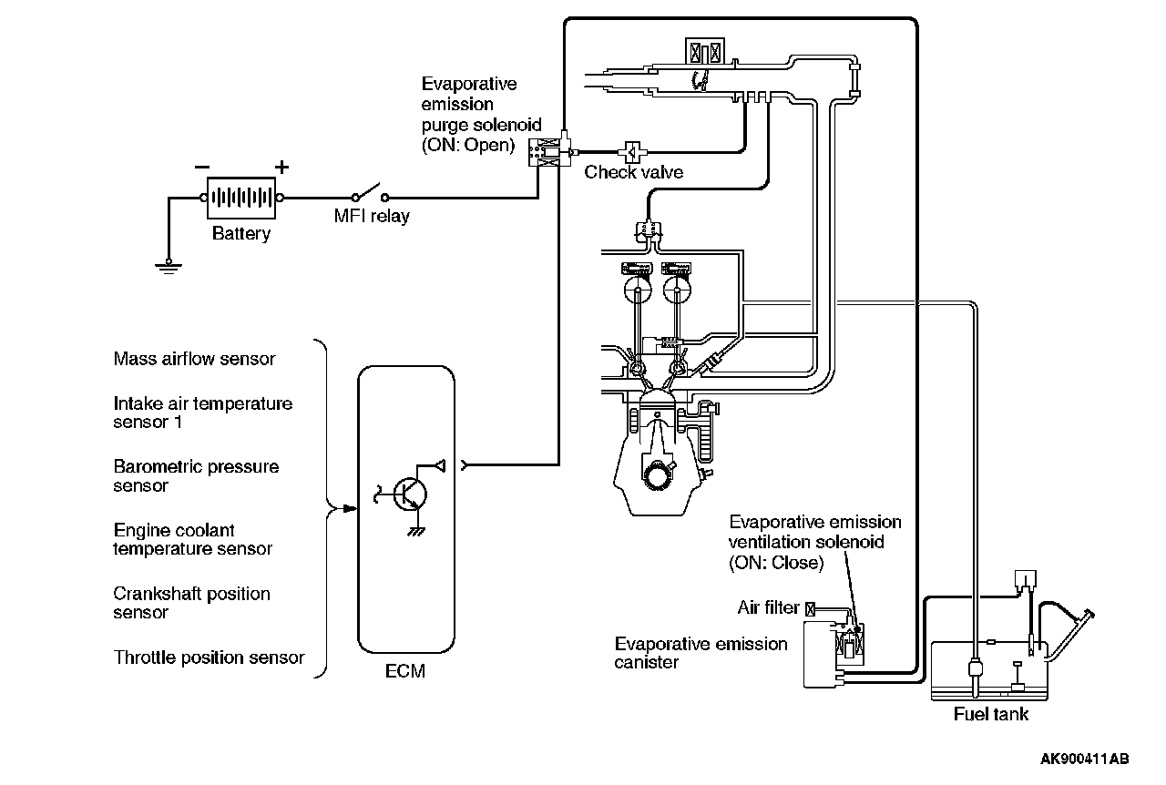 When the engine coolant temperature is low or when the intake air quantity is small (when the engine is at idle, for example), the engine control module (ECM) brings the EVAP purge solenoid into the OFF state to shut off the fuel vapor flow to the intake manifold plenum. This ensures driveability when the engine is cold or running under low load and also stabilizes the emission level.