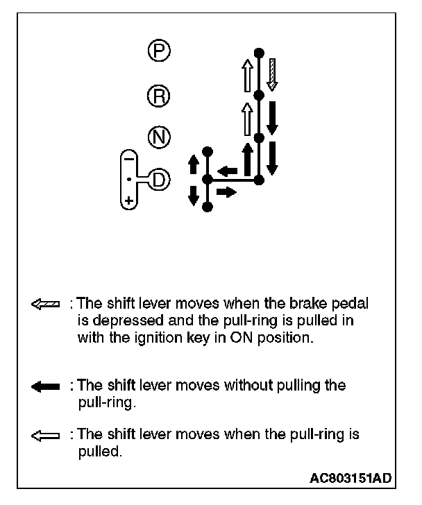 NOTE: Because the misoperation preventive device is equipped, the shift lever cannot be moved out of the P position unless the ignition switch is turned to the position other than LOCK (OFF) and the brake pedal is depressed.