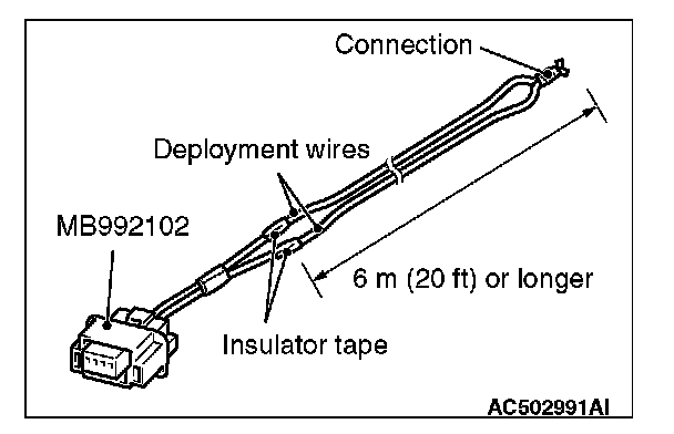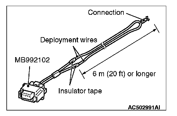 3. Connect deployment wires, each 6 meters (20 feet) or longer, to the two leads of special tool MB992102, and cover the connections with insulator tape. The other ends of the deployment wires should be connected to each other (short-circuited), to prevent sudden unexpected deployment of the air bag module.