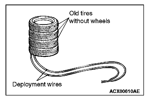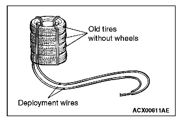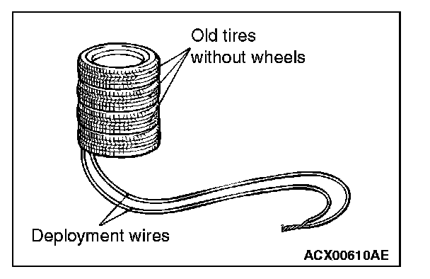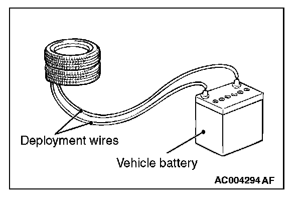 4. Connect deployment wires, each 6 meters (20 feet) or longer, to the two leads of special tool MB991885, and cover the connections with insulation tape. The other ends of the deployment wires should be connected to each other (short-circuited), to prevent sudden unexpected deployment of the air bag module.