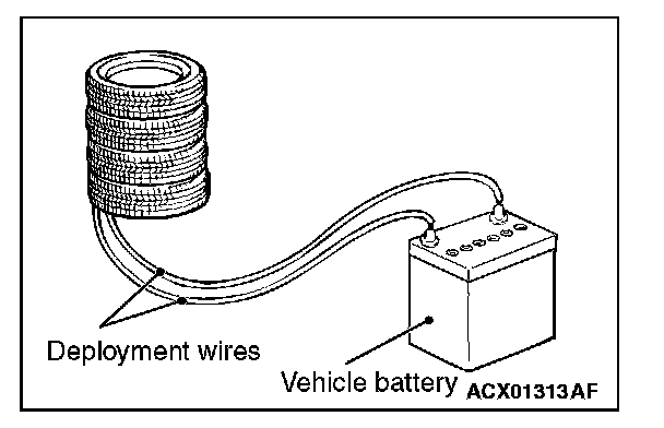 7. At a location as far away from the air bag module as possible, and from a shielded position, disconnect the two connected wires from each other, and connect them to the two terminals of the battery (which has been removed from the vehicle) to deploy the air bag.