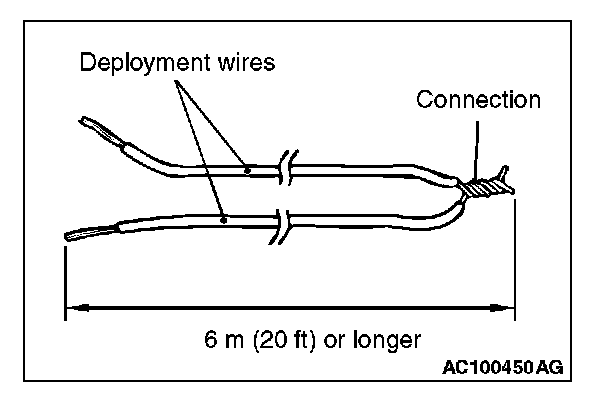 3. Connect deployment wires, each 6 meters (20 feet) or longer, to the two leads of special tool MB991885, and cover the connections with insulator tape. The other ends of the deployment wires should be connected to each other (short-circuited), to prevent sudden unexpected deployment of the air bag module.