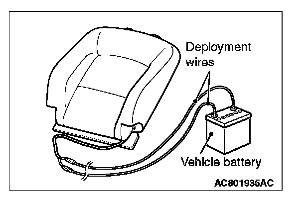 7. At a location as far away from the front seatback as possible, and from a shielded position, disconnect the two connected wires from each other, and connect them to the two terminals of the battery (which has been removed from the vehicle) to deploy the air bag.